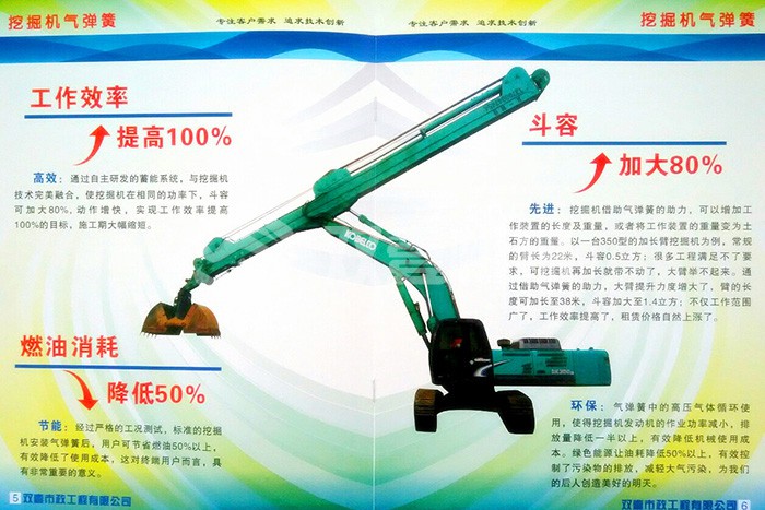 環(huán)保:氣彈簧中的高壓氣體循環(huán)使用,使得挖掘機發(fā)動機的作業(yè)功率減小,排放量降低一半以上,有效降低機械使用成本。綠色能源讓油耗降低50%以上,有效控制了污染物的排放,減輕大氣污染,為我們的后人創(chuàng)造美好的明天。